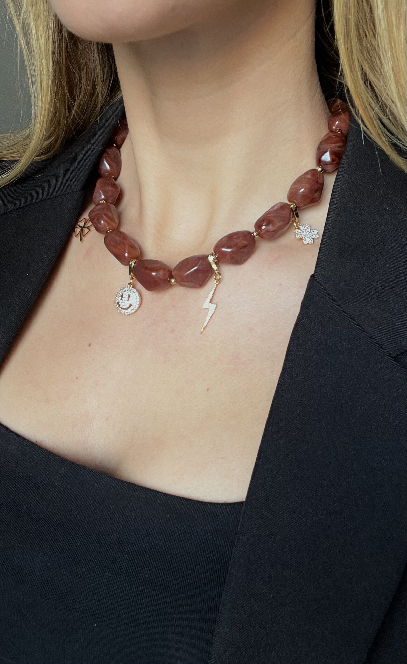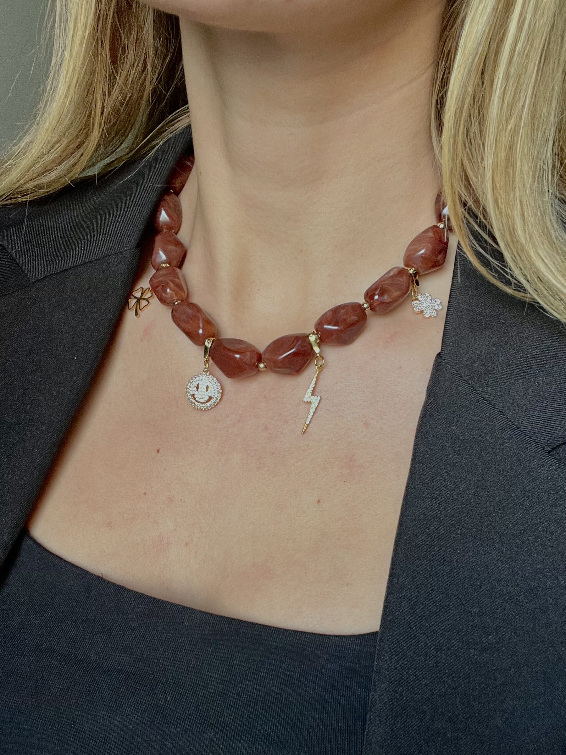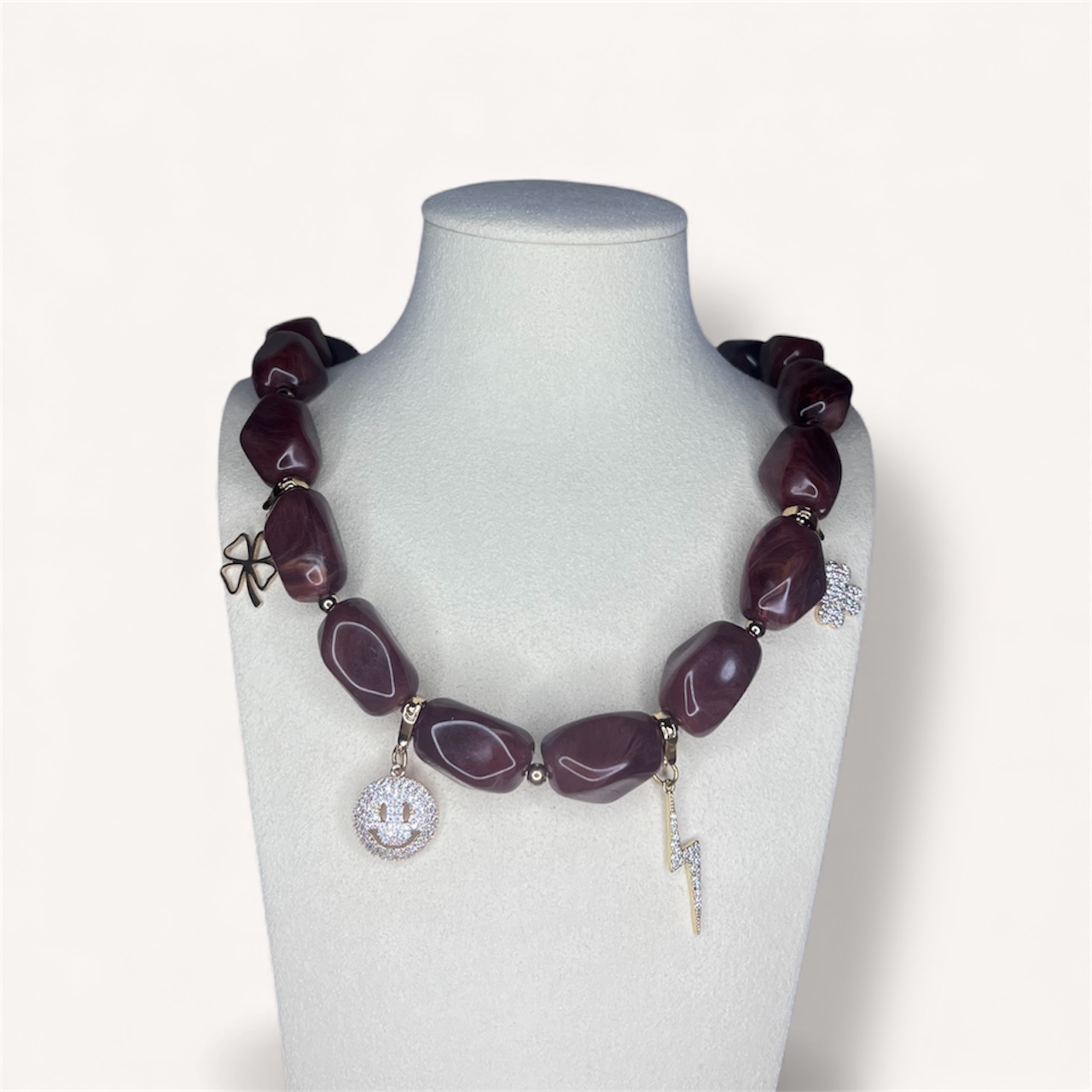 Deze combi deal bestaat uit een prachtige set charms uit onze collectie, gecombineerd met de bruine kralenketting voor een stijlvol statement sieraad. De warme bruin/burgundy tinten in combinatie met de speelse charms maken dit item een echte eyecatcher.